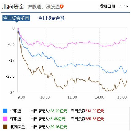 5月16日,沪指收涨0.58%,深证成指涨0.37%,创业板指涨0.33%,两市个股总体涨多跌少。北上资金全天净流出超29亿元,其中沪股通净流出23亿元,深股通净流出超5亿元。