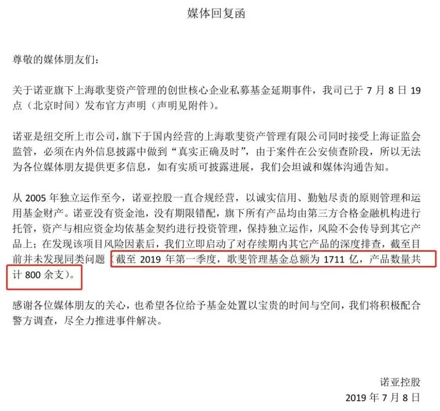 诺亚财富还发了一份《媒体回复函》,上面显示,关于诺亚旗下上海歌斐资产管理的创世核心企业私募基金延期事件,公司已于7月8日19点(北京时间)发布官方声明,发现该项目风险因素后,立即启动了对存续期内其它产品的深度排查,截至目前并未发现同类问题(截至 2019 年第一季度,歌斐管理基金总额为1711亿,产品数量共计800余支)。诺亚财富将积极配合警方调查,尽全力推进事件解决。