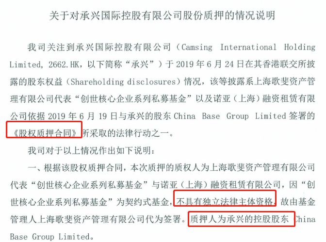 2、诺亚财富旗下歌斐资产代表“创世核心企业系列私募基金”以及诺亚融资租赁公司此前签署了承兴国际控股的《股权质押合同》。